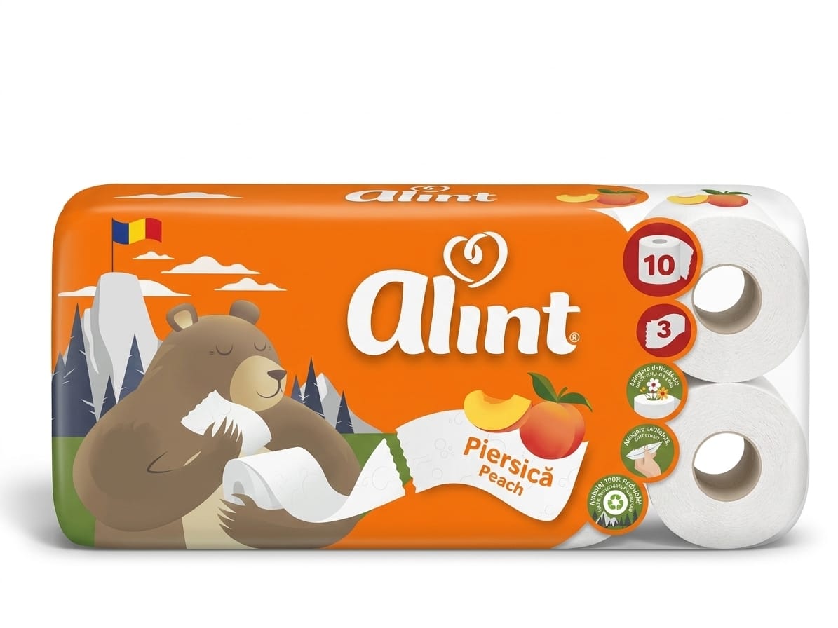 Hârtie igienică Alint, finețe in fiecare foaie. Parfum delicat de piersică, cu ambalaj 100% reciclabil.