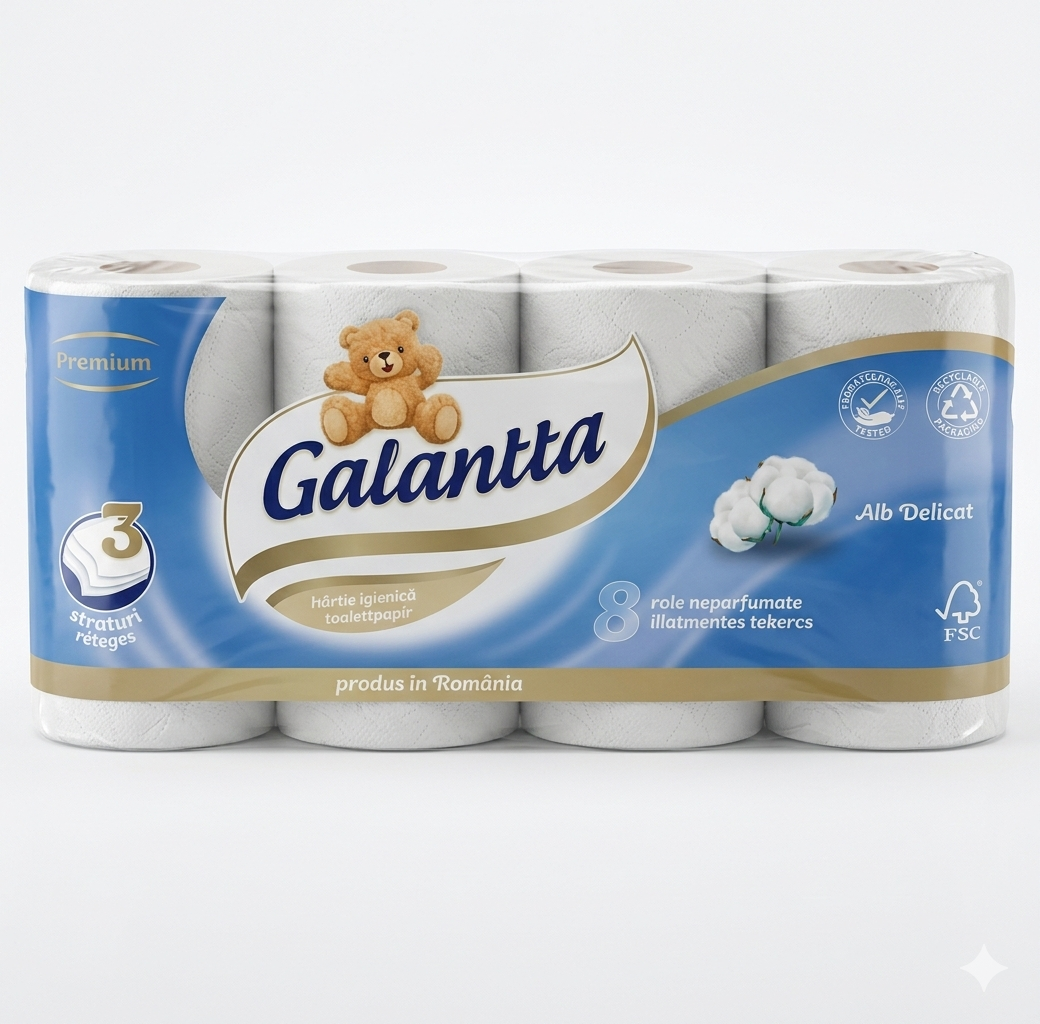 Experimentați îmbinarea perfect dintre finețe și rezistență. Hârtia igienică Galantta creată cu pasiune, este alegerea inteligentă și de înaltă calitate pentru gospodăriile ocupate care caută un confort de durată.
